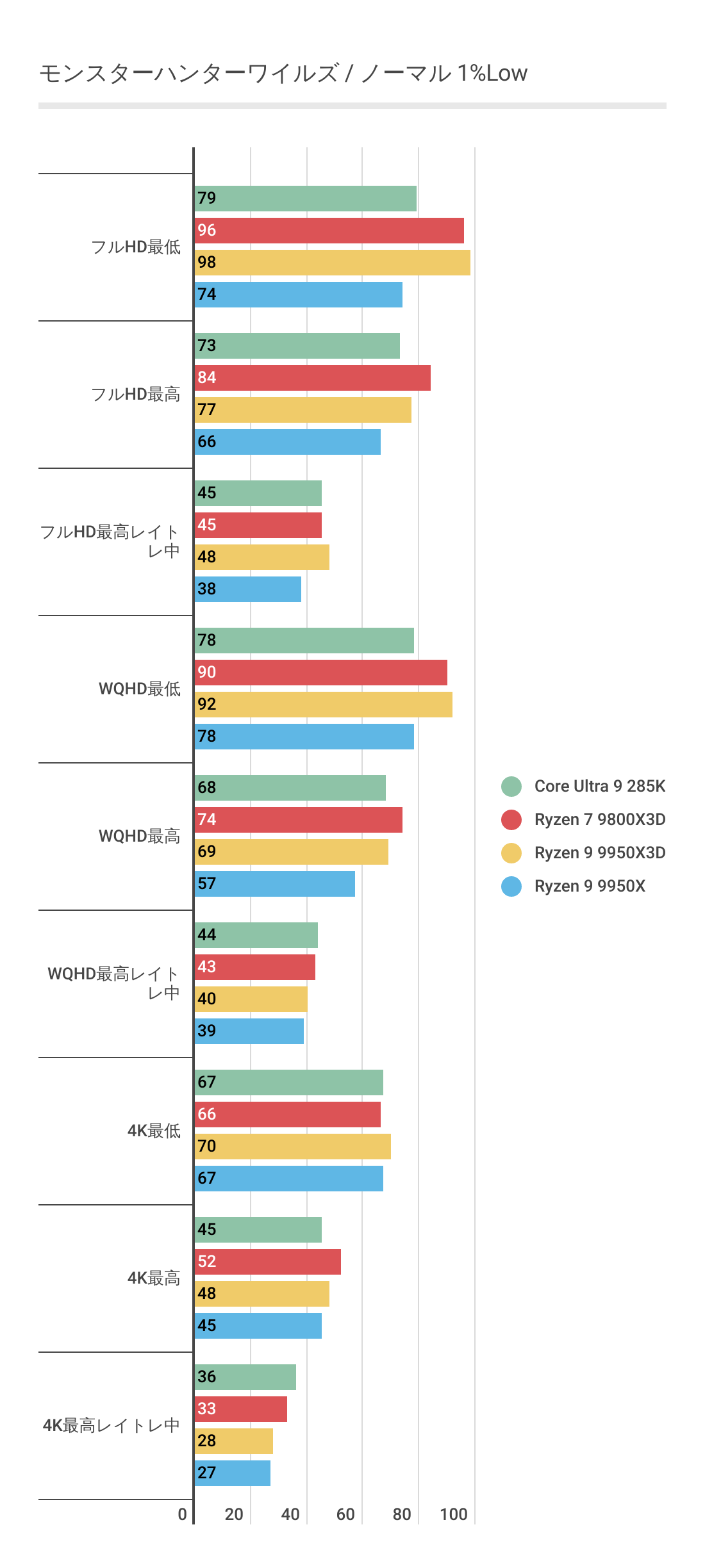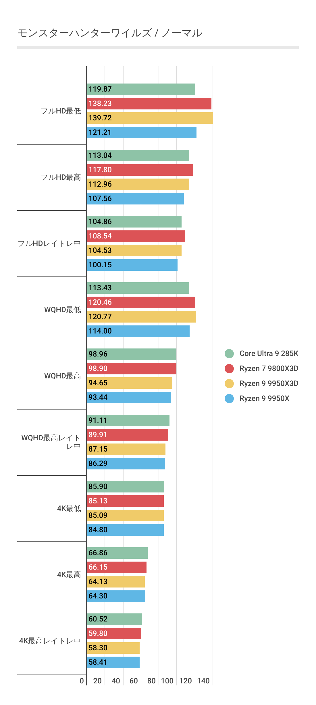 ただCore Ultra 9 285Kも健闘しており、特に4K領域ではわずかにRyzen 9 9950X3Dが負ける結果で最強ゲーム性能とはなっていません。