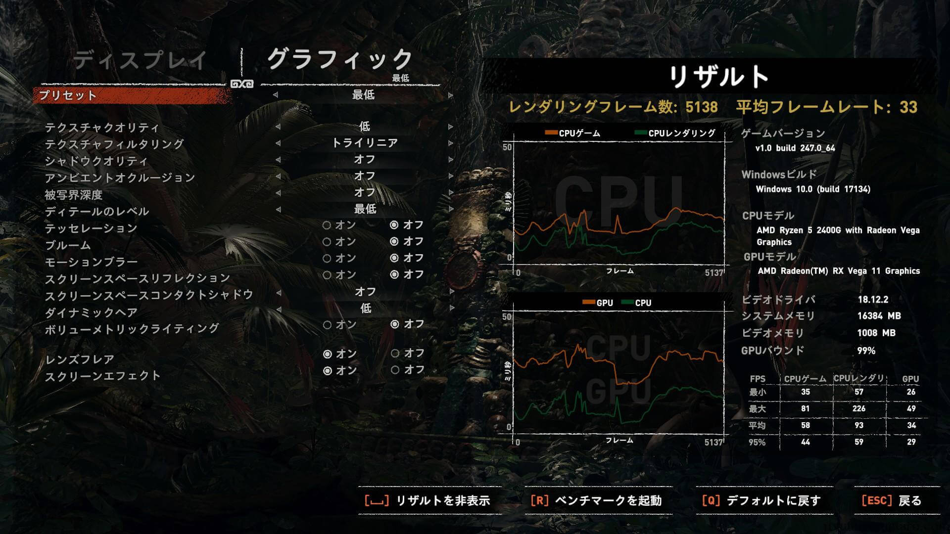 Ryzen3 2200Gではこの画質でも遊ぶのは難しかったので、