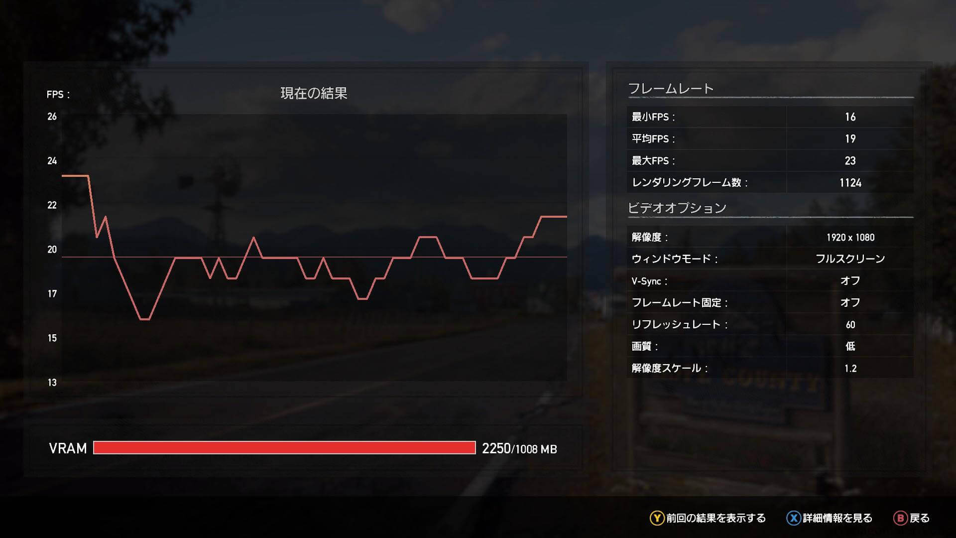 フルHD、低画質設定で、22fps前後とかなり低め。