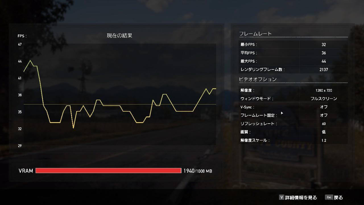 1600×800まで画質を落とせば低設定にて31~36fpsで遊ぶことができました!