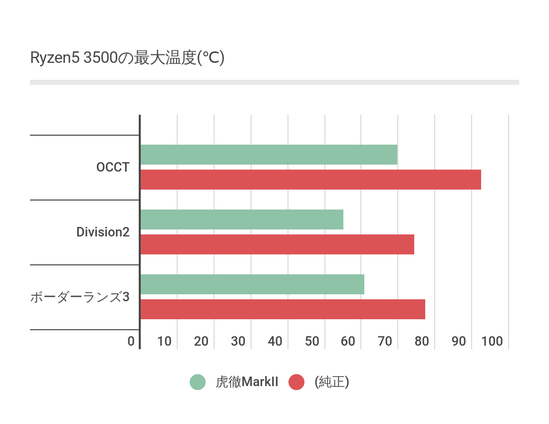 今回は鉄板クーラーの虎徹MarkIIと純正クーラーでいくつか比較しました。