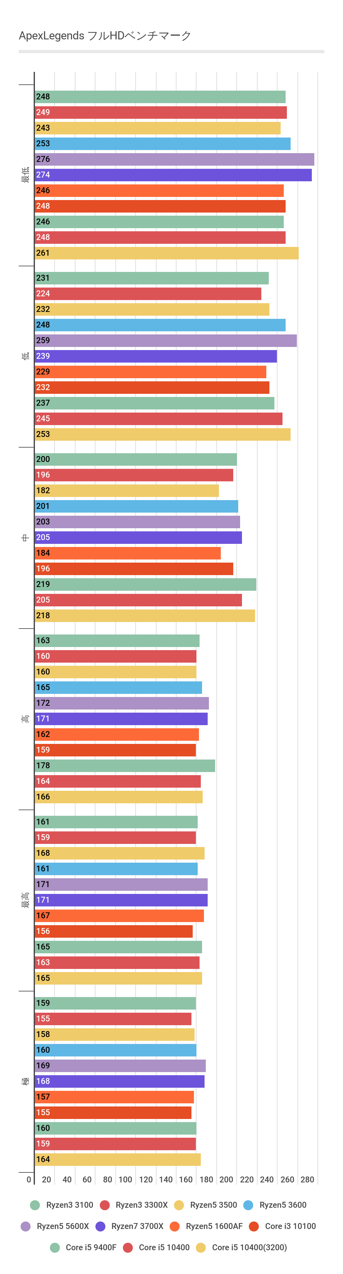 CPU/APU | Corei5 10400 | Corei5 9400F | Ryzen5 5600X | Ryzen5 3600 | Ryzen5 3500 | Ryzen7 2700 | Ryzen5 2600 | Ryzen5 1600AF |