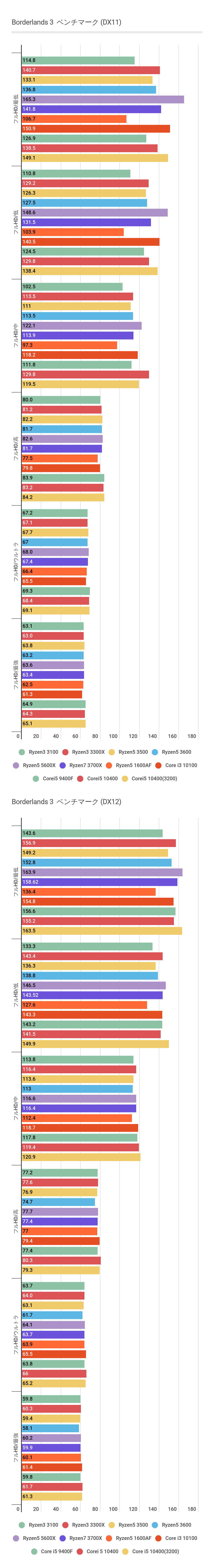 ボーダーランズ3がDX11で最大18fps、DX12で最大6fpsとなります。