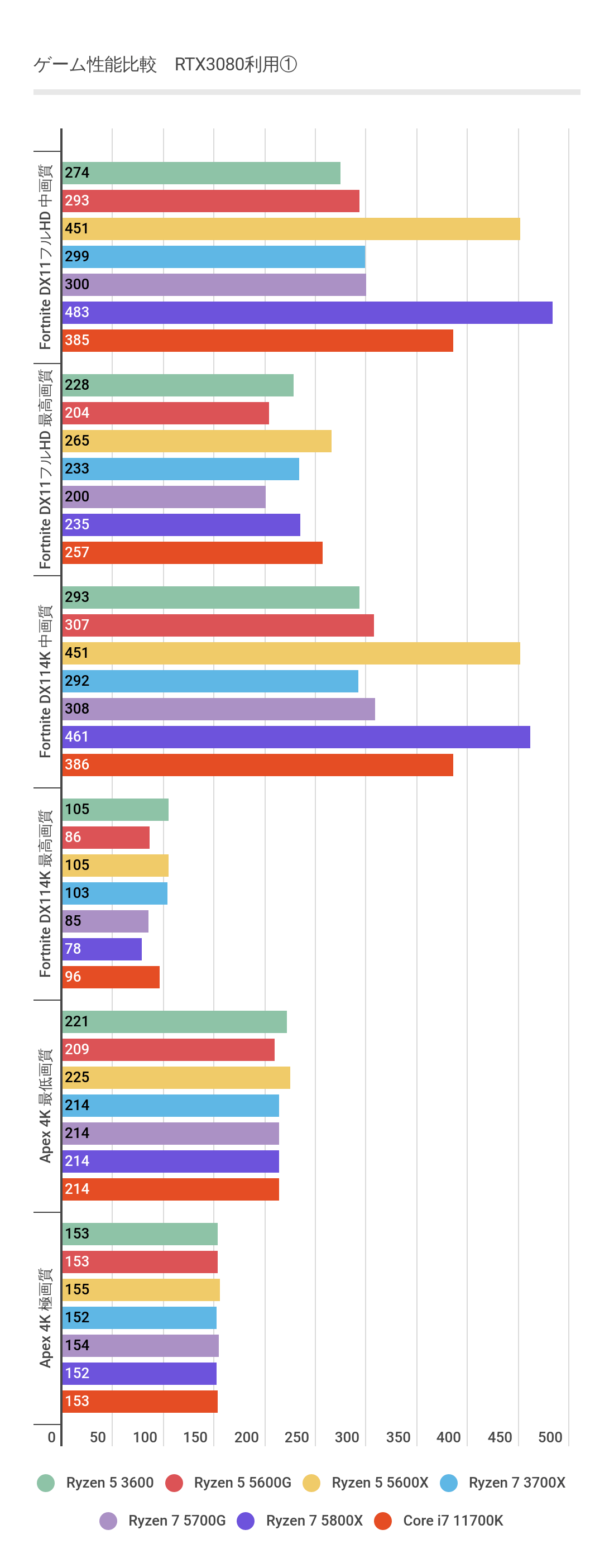 Ryzen 5 5600Xと比較すると、比較的CPU性能の影響を受けにくいApexですら、