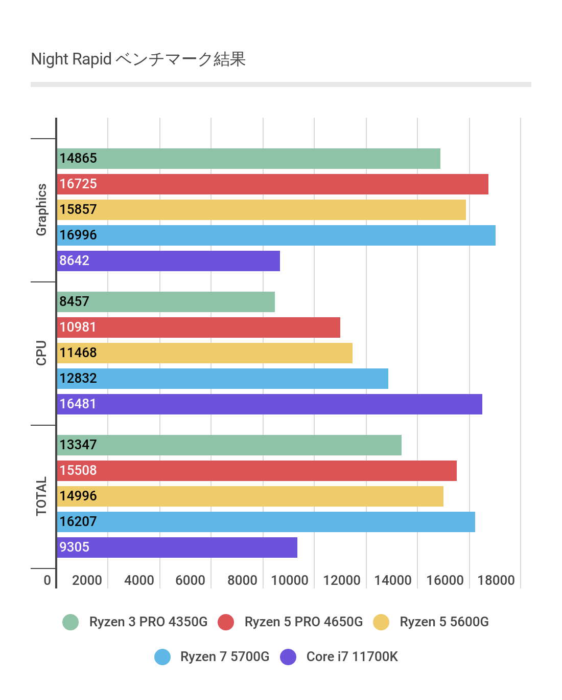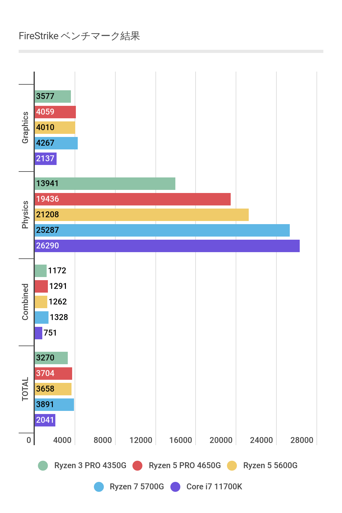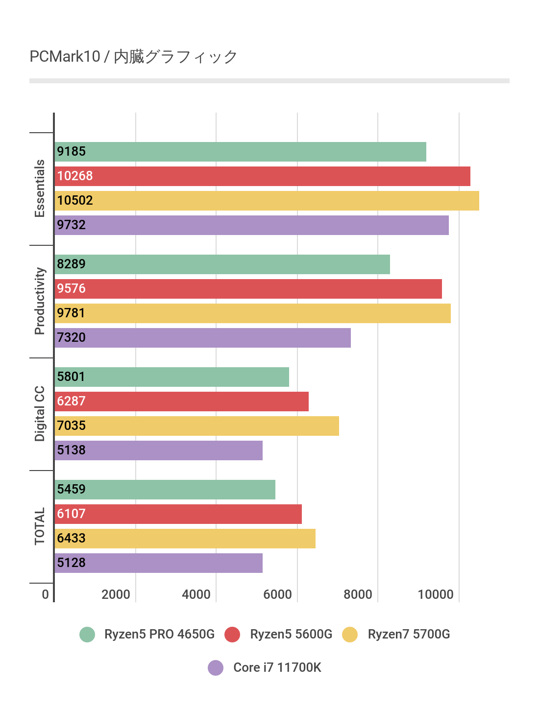 TOTALスコアではほぼほぼRyzen 5 4650Gと同等のスコアといったところ。