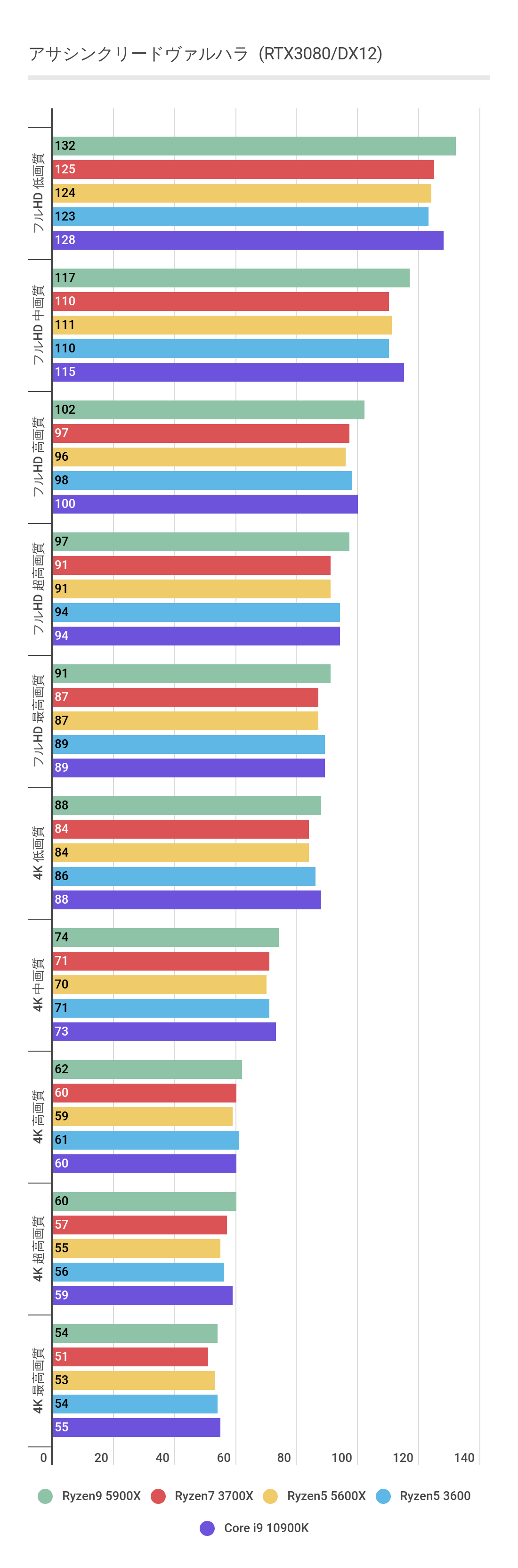 RTX 3080の性能をより引き出せているのは5600Xということになります。
